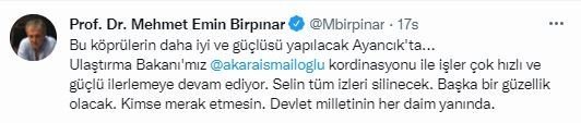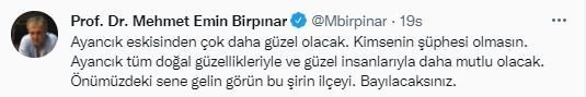 Sinop'ta yaşanan sel felaketinden etkilenen Ayancık ilçesine yönelik sosyal medya hesabından bir açıklama yapan Çevre ve Şehircilik Bakan Yardımcısı Prof. Dr. Mehmet Emin Birpınar, "Ayancık eskisinden çok daha güzel olacak. Kimsenin şüphesi olmasın. Ayancık tüm doğal güzellikleriyle ve güzel insanlarıyla daha mutlu olacak. Önümüzdeki sene gelin görün bu şirin ilçeyi. Bayılacaksınız. Bu köprülerin daha iyi ve güçlüsü yapılacak Ayancık'ta. Ulaştırma ve Altyapı Bakanımız Adil Karaismailoğlu'nun koordinasyonu ile işler çok hızlı ve güçlü ilerlemeye devam ediyor. Selin tüm izleri silinecek. Başka bir güzellik olacak. Kimse merak etmesin. Devlet milletinin her daim yanında" ifadelerini kullandı.