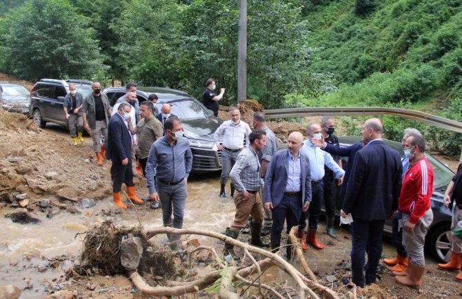 Rize'de dün öğleden sonra etkili olan sağanak yağışın ardından meydana gelen sel ve heyelan nedeniyle zarar gören bölgelerde inceleme yapmak için İçişleri Bakanı Süleyman Soylu, Çevre ve Şehircilik Bakanı Murat Kurum ve Ulaştırma ve Altyapı Bakanı Adil Karaismailoğlu incelemelerde bulundu.