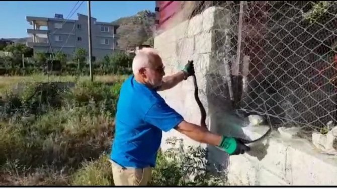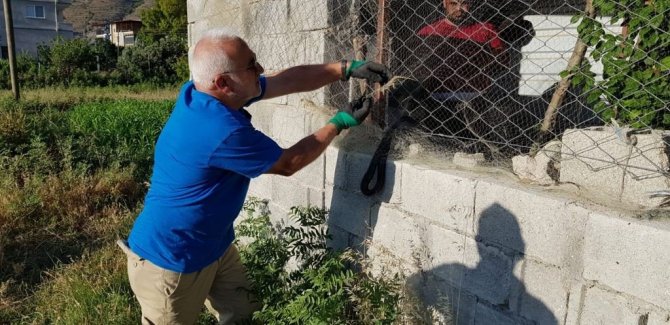 Hatay'ın Samandağ ilçesinde bahçedeki balıkçı ağına takılan kara yılan, Samandağ Çevre Koruma ve Turizm Derneği Başkanı Mişel Atik tarafından kurtarılarak doğal hayata bırakıldı.