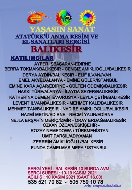 Büyük Önder Mustafa Kemal Atatürk adına 10 Kasım tarihinde başlayıp, 12 Kasım tarihine kadar "Balıkesir Atatürk'ü Anma Resim ve El Sanatları" sergisi açılıyor. Uluslararası açılacak sergiye 26 sanatçı 60 eser ile katılacak.