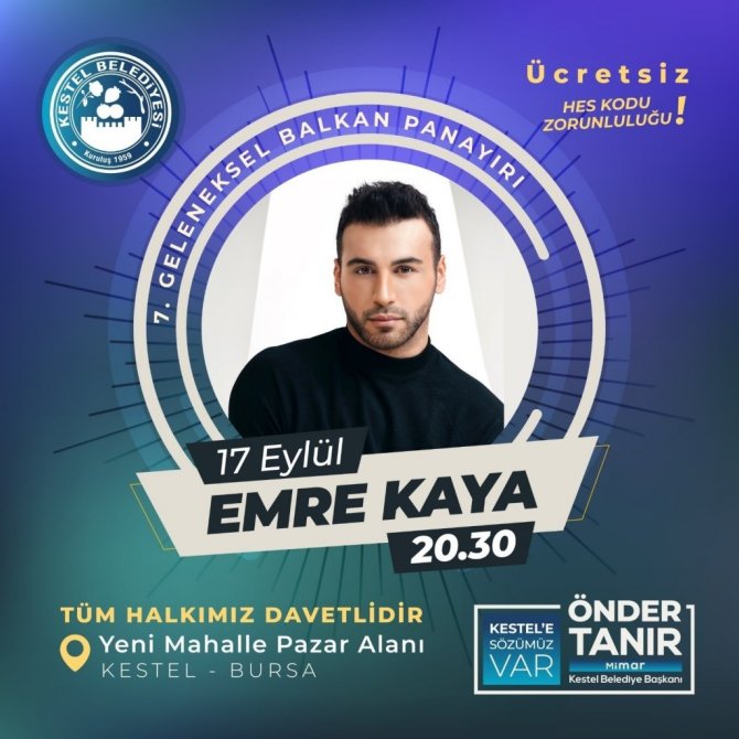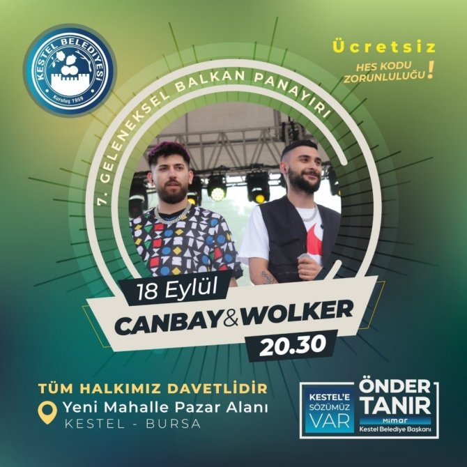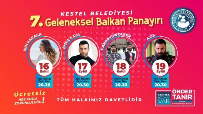 Kestel Belediyesi 7. Geleneksel Balkan Panayırı, 16-19 Eylül tarihleri arasında Yeni Mahalle Açık Otopark Alanı'nda gerçekleşecek. 4 gün sürecek olan panayırda ünlü sanatçılar Işın Karaca, Emre Kaya, Canbay & Wolker sahne alacak. 19 Eylül tarihinde ise "Balkanların Tarkan'ı olarak bilinen dünyaca ünlü sanatçı Azis sahneye çıkacak. Yemek stantları ve oyun alanlarının da yer alacağı panayır, ücretsiz olarak halka açık olacak. Öte yandan Covid-19 tedbirlerinin üst seviyede tutulacağı panayırda HES kodu zorunluluğu olacak.