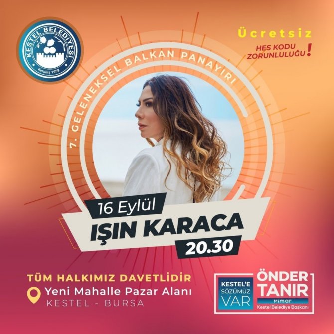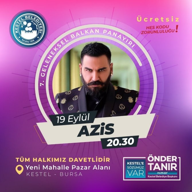 Bursa'nın Kestel Belediyesi, bu yıl 7'incisini düzenleyeceği Balkan Panayırı'nda sürpriz sanatçıları Kestelliler ile buluşturuyor. 4 gün boyunca Işın Karaca, Emre Kaya, Canbay&Wolker'ın sahne alacağı panayırın son gecesinde ise dünyaca ünlü sanatçı Azis sahne alacak.