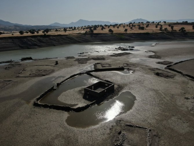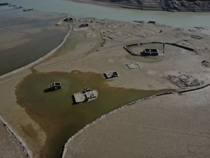 Yağışların azlığı ve yaşanan kuraklık sonrası 30 yıl önce baraj göleti içinde yer alan köyün kalıntıları 5 ay önce ortaya çıkmıştı. Yaz mevsimi nedeniyle suların daha da azaldığı barajda ortaya çıkan gizemli manzara drone ile görüntülendi. Görüntülerde, ortaya çıkan taş ev kalıntıları, çeşme ve iki adet köprü de gün yüzüne çıktı. Boşalan baraj göletinin arazisinde ise çevre halkı tarafından çeşitli ürünler ekiliyor.
