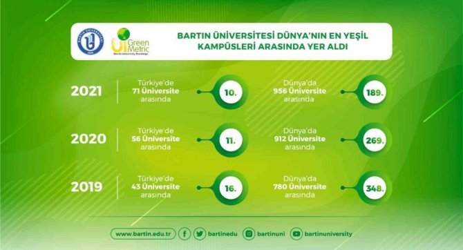 Sürdürülebilirlik ve çevre bilinci konusunda uluslararası bir platform olan Green Metric (Yeşil Ölçüm) Dünya Üniversiteler Sıralaması açıklandı. "Yeşil Üniversiteler 2021" sıralamasında Dünya genelinde 956 yükseköğretim kurumunun değerlendirildiği sıralamada Türkiye'den 71 üniversite yer aldı. "Sürdürülebilir Yeşil Kampüs" çalışmaları kapsamında birçok alanda önemli çalışmaların yapılmaya devam edildiği Bartın Üniversitesi, Türkiye'nin en iyi 10'uncu yeşil kampüsü olurken Dünya'da ise 189'uncu sıraya yükselme başarısı gösterdi. Bartın Üniversitesi, 2019 yılında Türkiye'deki 43 üniversite arasında 16'ıncı, Dünya'daki 780 üniversite arasında 348'inci; 2020 yılında ise Türkiye'deki 56 üniversite arasında 11'inci, Dünya'daki 912 üniversite arasında 269'uncu olmuştu. Böylece Bartın Üniversitesi bir önceki yıllara göre hem Dünya genelinde hem de Türkiye genelinde sıralamada yer verilen üniversite sayısı artmış olmasına rağmen sıralamadaki yerini yükseltmeyi başardı.