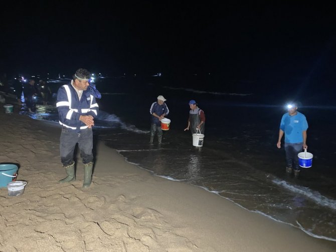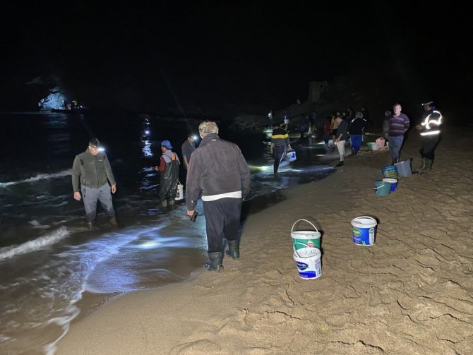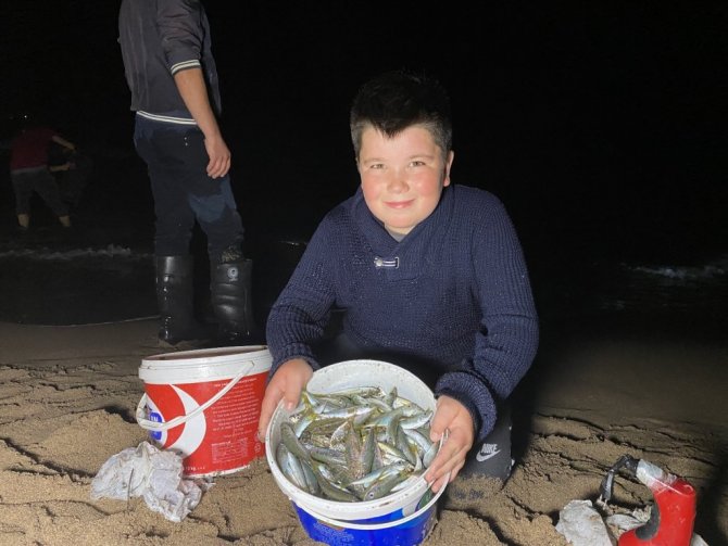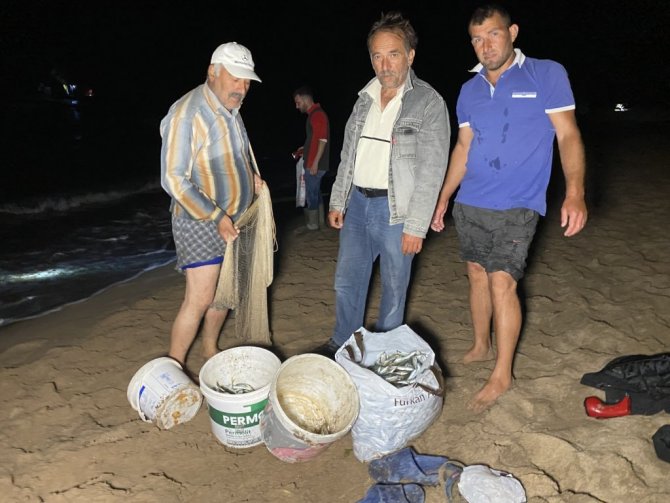 Sahilden kovalar dolusu balık toplayan vatandaşlar evlerinin yolunu tutarken, birçok vatandaşın da sahil kıyısındaki balık nöbeti devam etti.