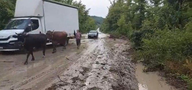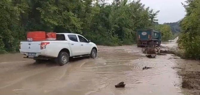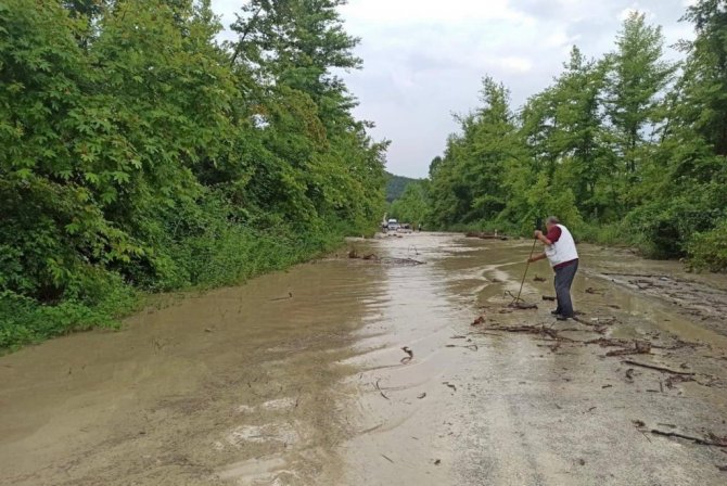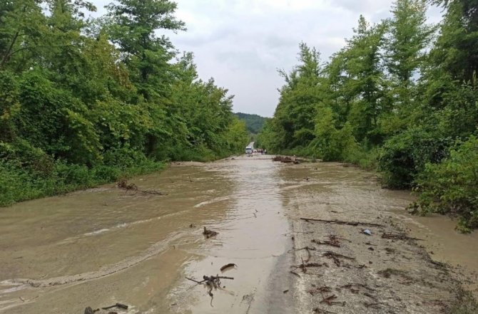 Bartın'ın Ulus ilçesinde sağanak yağış sonrası dere taştı. Taşkın suları karayolunun kısmen kapanmasına neden oldu.