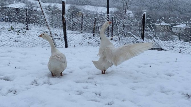 Bartın'ın yüksek kesimlerinde etkili olan kar yağışından kazlar da etkilendi.