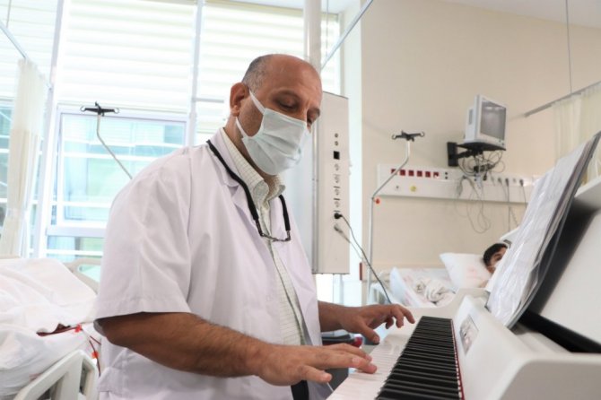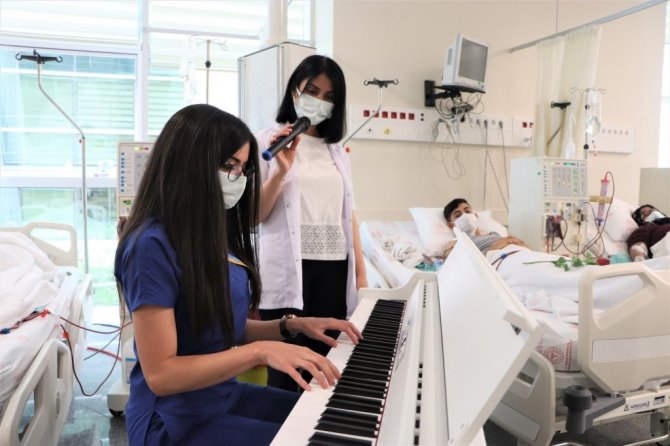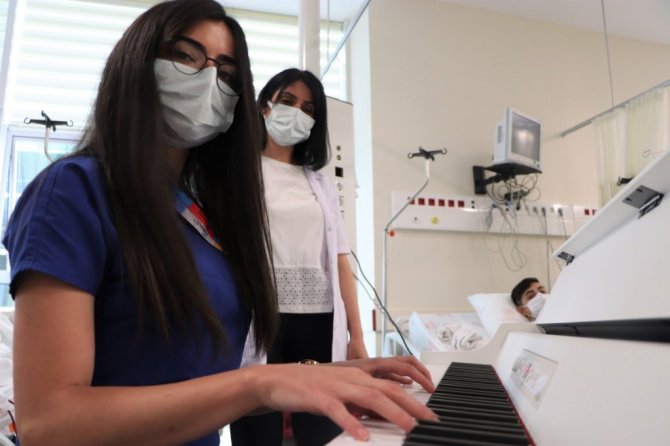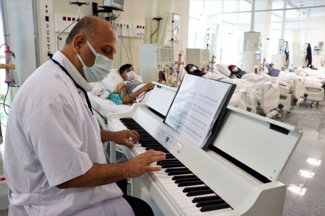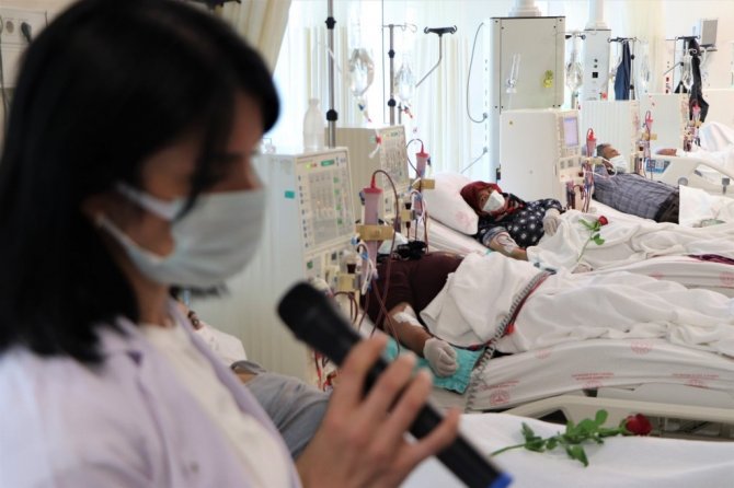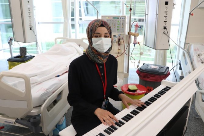 Diyaliz Hemşiresi Hilal Olgun, "Müzikle burada Halk Eğitim Merkezi'nin verdiği bir koroya katılarak başladık. Daha sonrasında piyano dersleri almaya başladım. Derslerden sonra bu müziği hastalarımızla paylaşmak istedik. Arkadaşlarımla burada seanslı olan hastalarımıza hem tedavi uyguluyoruz hem de müzikli terapi uygulamış oluyoruz" diye konuştu.