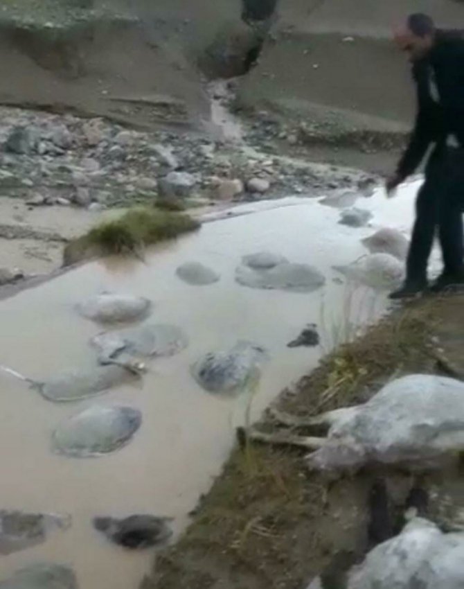 Van'ın Başkale ilçesinde etkili olan dolu ve sağanak nedeniyle meydana gelen sel felaketi sonucu küçükbaş hayvanlar telef olurken, Van-Hakkâri yolunda oluşan...