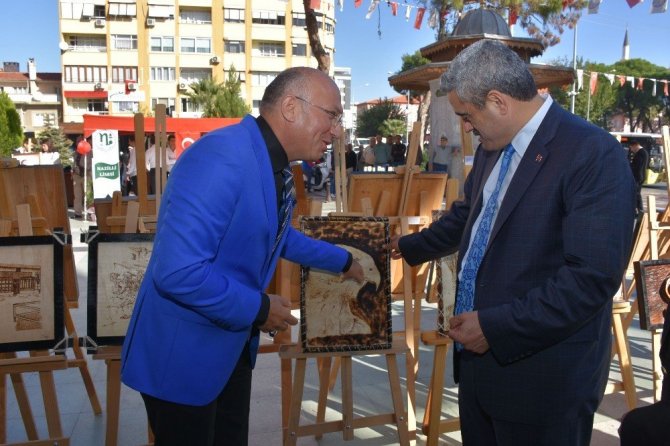 Nazilli Lisesi öğretmenlerinden Murat Akcan, ahşap üzerine yakma resim sanatı ile Belediye Başkanı Haluk Alıcık’ın portresini yaparak kendisine hediye etti.