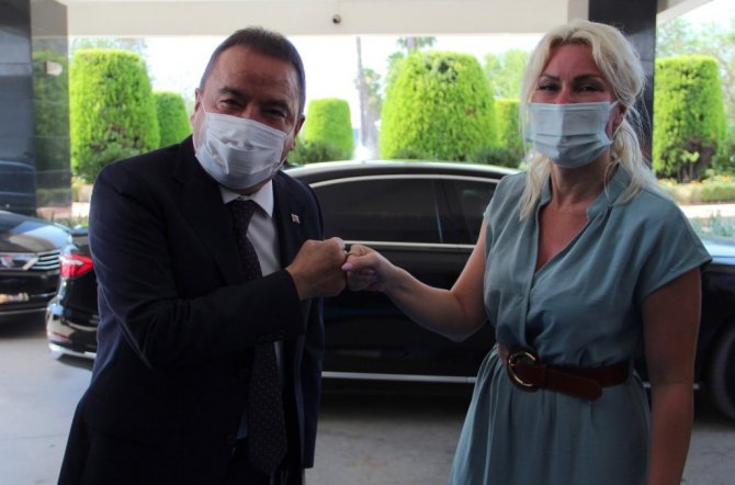 Büyükşehir Belediye Başkanı Muhittin Böcek, 109 gün korona virüs tedavisi gördüğü ve kendisiyle yakından ilgilenen Akdeniz Üniversitesi Hastanesi Rektörü Prof. Dr. Özlenen Özkan'ı ziyaret etti. Rektör Özkan tarafından karşılanan Böcek, yumruk selamlaşmasının ardından hemen maskesini taktı.