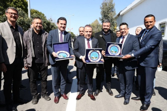 Daha sonra Kumluca Sanayi Sitesi Başkanı Durmus Tomaç da sanayi sitesinin 20 yıldır süre gelen asfalt sorununu sıcak asfalt ile çözdüğü için Büyükşehir Belediye Başkanı Muhittin Böcek'e teşekkür plaketi verdi.