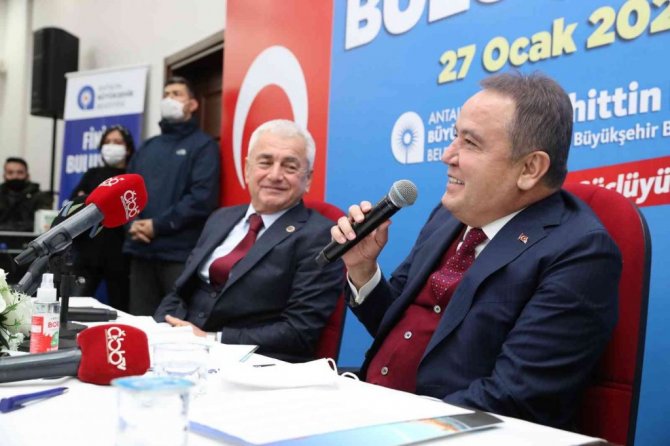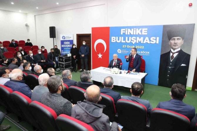Başkan Muhittin Böcek, Finike'ye önemli yatırımlar yaptıklarını belirterek, "Finike Belediyemizin 60 milyon TL'lik bütçesi kadar Büyükşehir Belediyesi olarak Finike'ye yatırım yapıyoruz. Finike'mize yakışır bir Cumhuriyet Meydanı yapacağız. Muhtarlarımızın, STK temsilcilerimizin talep ve önerilerini alarak, birlikte çözüm önerileri getiriyoruz. Ben sizlere yapamayacağım hiçbir söz vermem. Seçim döneminde Finike meydanına gelip miting yaptığımız günlerde ne söylediysek onları yapmaya çalışıyoruz. Hayatım boyunca vatandaşlarımızın hep dertlerine derman olmaya çalıştım. Ne söylediysek onu da sırasıyla yapıyoruz" dedi.
