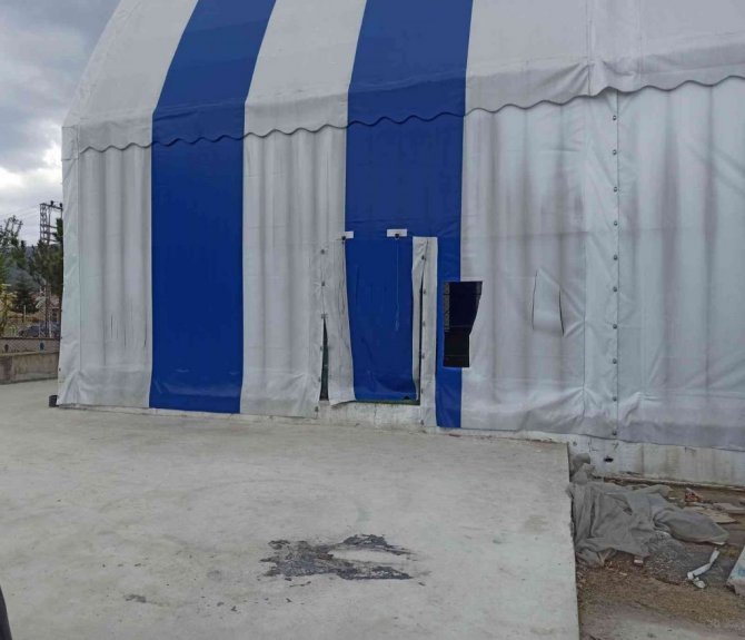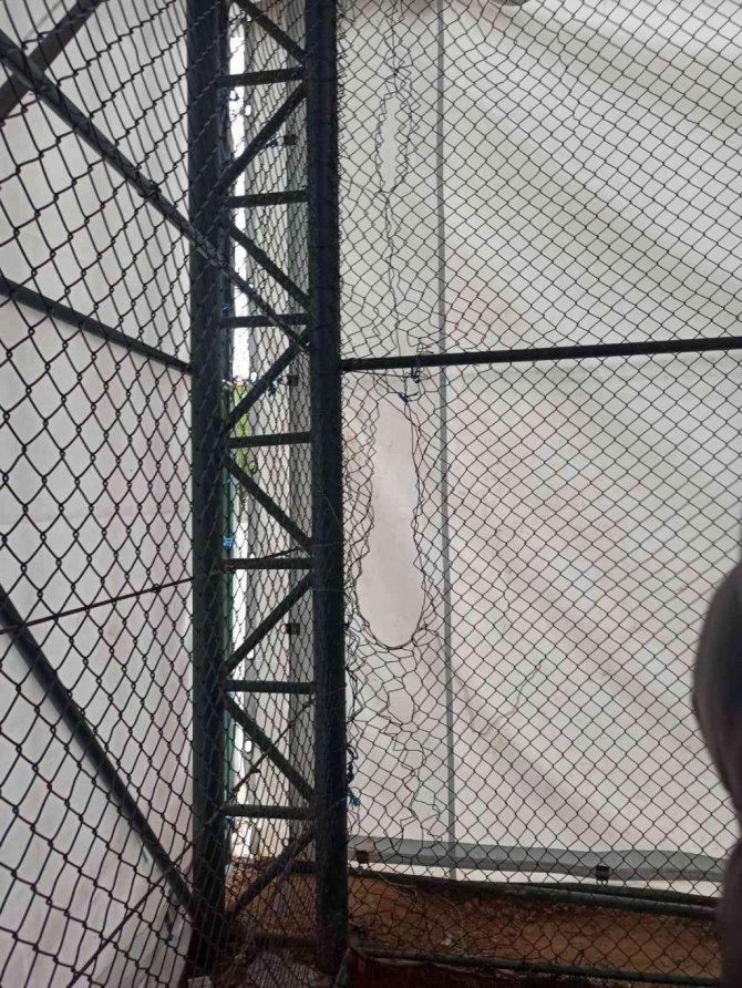 Fotoğraflarda ise tellerinin ve dış brandasının kesildiği, zeminde hasarlar görüldüğü, tuvalet kapısının kırıldığı gibi kareler yer alıyor.