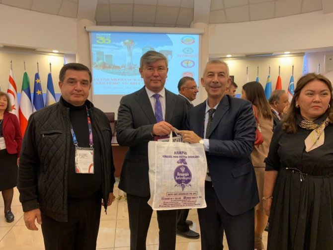 Kardeş belediye olmak için Kazakistan Büyükelçiliği yetkilileriyle istişarede bulunan Cömertoğlu, katılımcılara Arapgir İlçesi'nin coğrafi İşaretli ürünü olan Arapgir Mor Reyhanından elde edilen ürünlerden oluşan hediyelerini takdim etti.