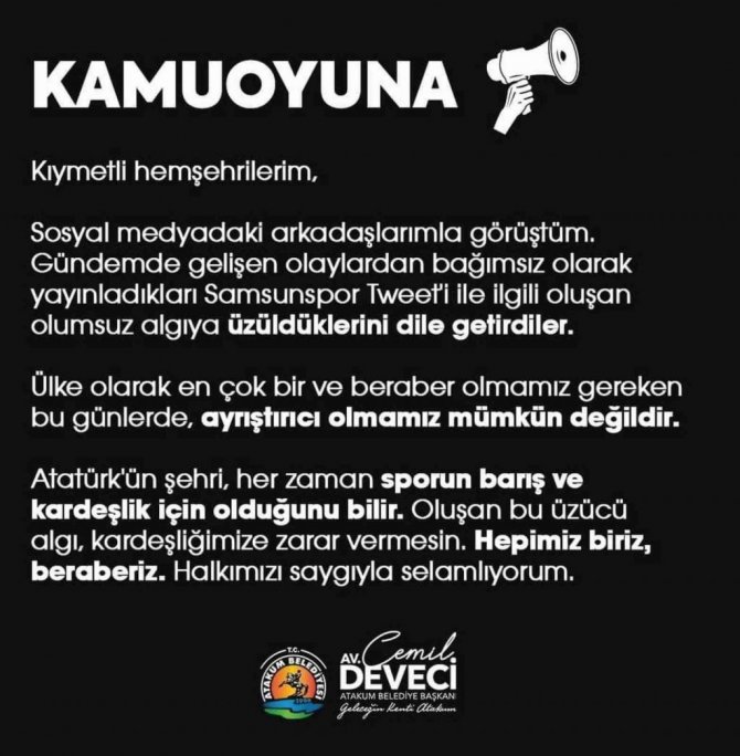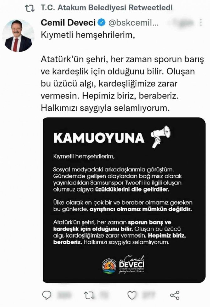 Paylaşımın kaldırılması hakkında açıklamada bulunan Atakum Belediye Başkanı Cemil Deveci, "Kıymetli hemşehrilerim, sosyal medyadaki arkadaşlarımla görüştüm. Gündemde gelişen olaylardan bağımsız olarak yayınladıkları Samsunspor tweeti ile ilgili oluşan olumsuz algıya üzüldüklerini dile getirdiler. Ülke olarak en çok bir ve beraber olmamız gereken bu günlerde, ayrıştırıcı olmamız mümkün değildir. Atatürk'ün şehri, her zaman sporun barış ve kardeşlik için olduğunu bilir. Oluşan bu üzücü algı, kardeşliğimize zarar vermesin. Hepimiz biriz, beraberiz. Halkımızı saygıyla selamlıyorum" ifadelerini kullandı.