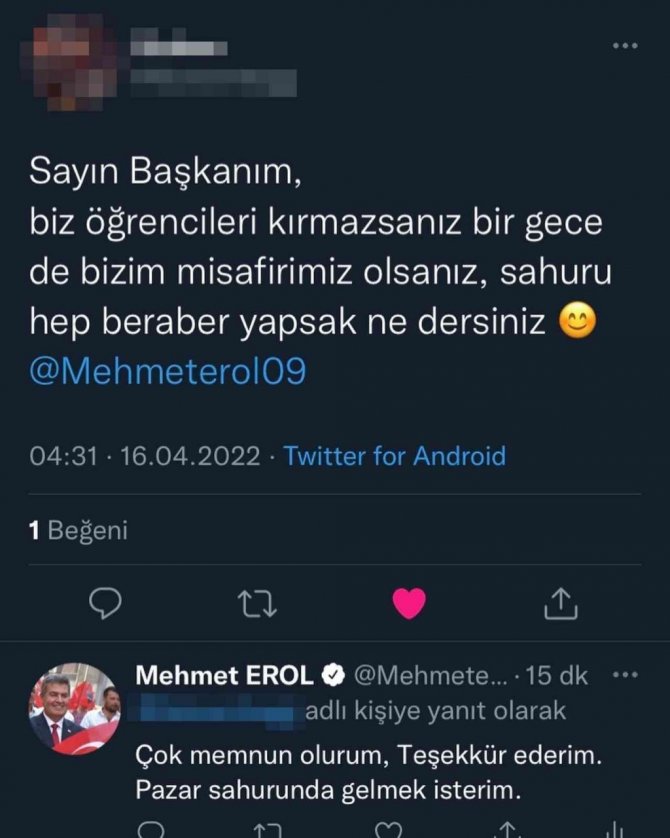 Konu ile ilgili sosyal medya üzerinden öğrencilere teşekkür eden Başkan Erol; "Cuma gecesi sahurda Aydın Adnan Menderes Üniversitesi MYO öğrencileri beni sahura davet etmişlerdi. Ertesi gün Kaymakamımız Alper Açıkgöz ile birlikte davete icabet ettik. Öğrencilerimizle sahur yaptık, derslerinden konuştuk. Keyifli bir kaç saat geçirdik. Bu sahuru organize eden başta öğrencilerimiz olmak üzere MYO Müdürümüz Necati Beye ve emeği geçenlere teşekkür ederim" dedi.