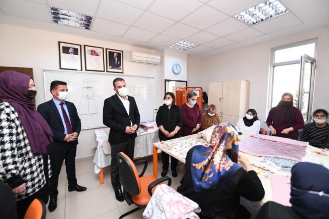 Yapılan çalışmaları çok beğenen Başkan Ertuğrul Çetin, Belediye Başkan Yardımcısı Gürhan Yüzbaşıoğlu ile birlikte Hanım Evleri Şefi Aysun Tulumbacı'dan kurs çalışmaları ve faaliyetleri hakkında da bilgiler aldı.