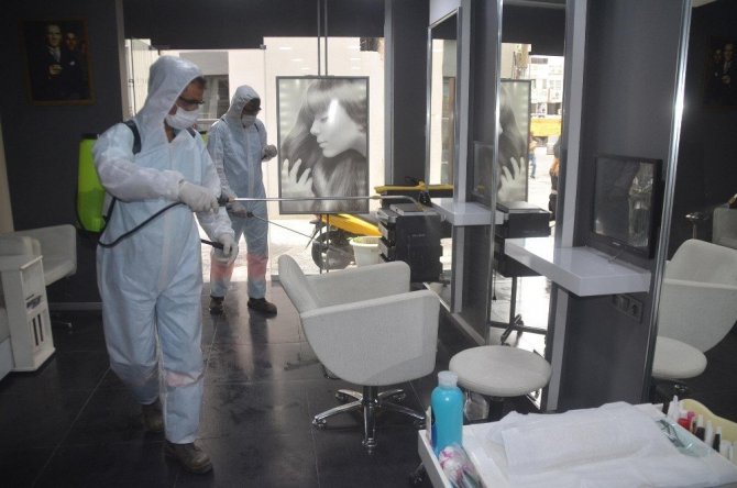 Kuşadası Belediyesi, 11 Mayıs’ta kapılarını açacak olan kuaför, berber ve güzellik salonlarını korona virüs’e karşı dezenfekte etmeye başladı. İşletmelere ayrıca hastalık riskini en aza indirgemek amacıyla maske ve el dezenfektanı dağıtılıyor.