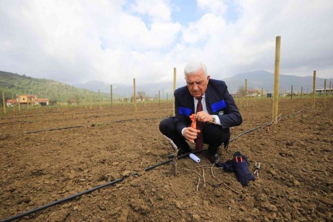 Başkan Dr. Osman Gürün, Muğla Büyükşehir Belediyesi tarafından üzüm yetiştiriciliğini desteklemek ve yerel şarap markasının oluşturulması için Fethiye ilçesi Yeşilüzümlü Mahallesinde kurulan asma bahçesini ziyaret etti. Yeşilüzümlü koleksiyon bağı aşılama çalışmalarını ziyaret ederek üretim süreci ile ilgili bilgi alan Başkan Gürün, örnek bağ aşısı uygulama çalışması gerçekleştirdi.