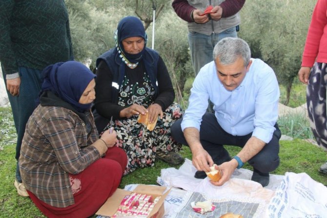 Ziyaret ve incelemeleri sırasında işçiler ile birlikte zeytin toplayan Kaplan, tarladakilere helva ekmek ikram etti.