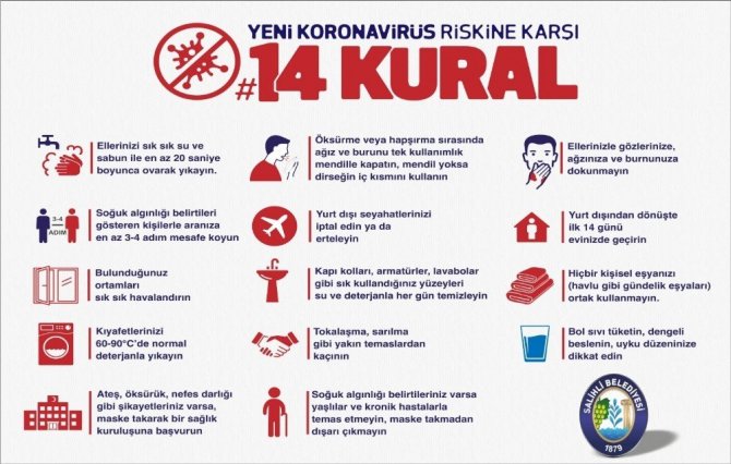 Ülkemizde de görülmeye başlayan korona virüs vakalarına karşı zor bir süreçten geçildiğini ifade eden Salihli Belediye Başkanı Zeki Kayda, devletin ve Sağlık Bakanlığının aldığı tüm tedbirlere uyulmasını istedi. Salihli’de Kaymakam Mehmet Kamil Sağlam ile birlikte hükümetin aldığı tüm tedbirleri harfiyen uyguladıklarını belirten Başkan Kayda, şunları söyledi: “Salihli Belediyesi olarak toplum sağlığını korumak amacıyla ilçe genelinde ilaçlama ve dezenfekte çalışmalarına aralıksız devam ediyoruz. Cadde ve sokaklarımızı temizliyoruz. Özellikle kamusal alanlar ile toplumsal kullanım alanlarında insan sağlığını tehdit eden virüs ve bakterilere karşı ilçemizdeki tüm kamu, kurum ve kuruluşlarında ilaçlama yaparak yeni tip korona virüse karşı etkin önlemler alıyoruz. Toplum ve insan sağlığını ciddi şekilde tehdit eden virüsün yayılmasını önlemek için hep birlikte mücadele etmeliyiz. Mümkün olduğunca kalabalık yerlerden uzak durmalıyız ve mecbur kalmadıkça evden dışarı çıkmamalıyız. Halk sağlığı açısından toplu yaşanılan yerler ile ortak kullanım alanlarında temizlik ve el hijyenine çok dikkat ederek Sağlık Bakanlığı tarafından belirlenen 14 kurala mutlaka uymalıyız. Yurt dışı bağlantısı olan insanlarımızdan 14 günlük karantina kuralına mutlaka uymalarını istiyorum. Ülke olarak kenetlenmeliyiz ve hükümetimiz ve Sağlık Bakanlığımız tarafından virüse karşı alınan tüm önlemlere de mutlaka riayet etmeliyiz. Birlikte mücadele ederek bu salgın hastalıktan korunabiliriz”