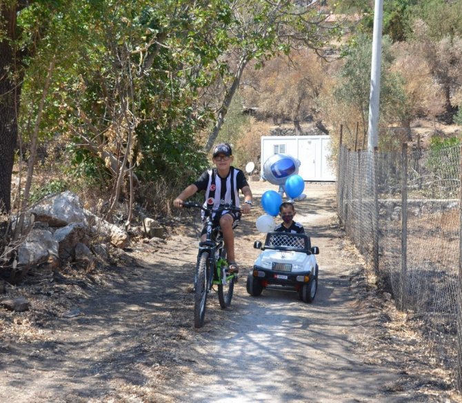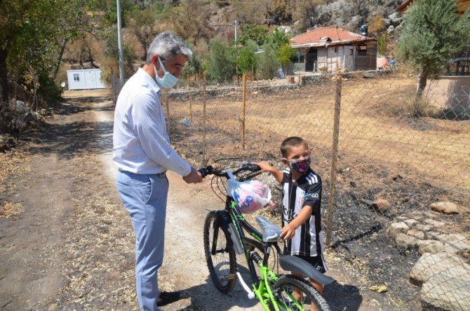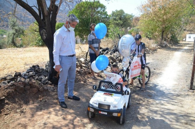 Yangın felaketinde evlerini kaybeden aileleri ziyarette küçük Çınar'a hediye sözü veren Marmaris Belediye Başkanı Mehmet Oktay bu sözünü yerine getirdi.
