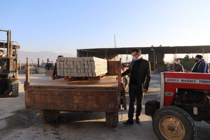 Alaşehir Belediyesi Fen İşleri Şantiyesinde 3 bin 500 adet beton bağ direklerinin çiftçilere teslim edilmesi çalışmalarını izleyen Ahmet Öküzcüoğlu, çiftçilerle sohbet etti.