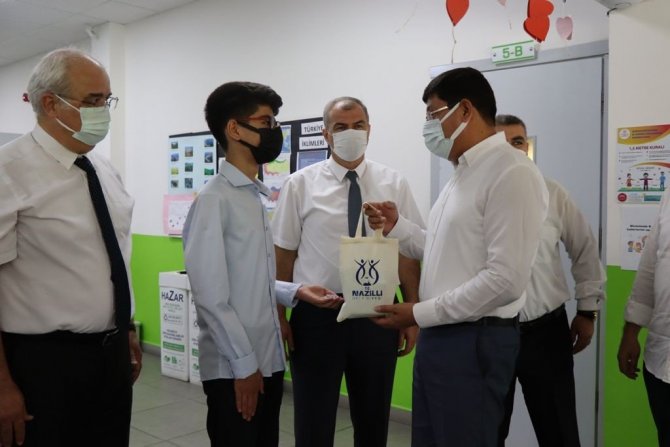 Nazilli Belediye Başkanı Kürşat Engin Özcan, Liselere Geçiş Sistemi'nde 500 tam puan alarak Türkiye 1'incisi olan Emre Berat Keser ve ailesini ziyaret ederek hediye takdim etti.