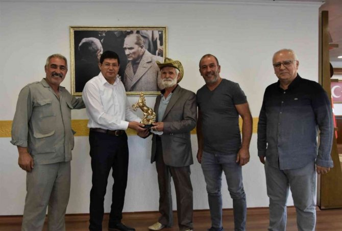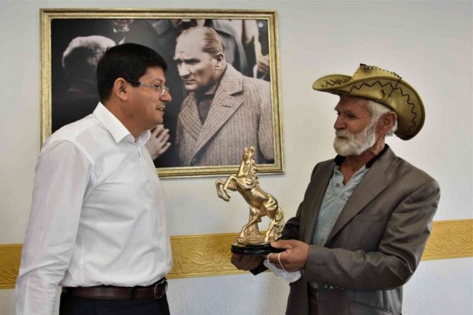 Milli Sporcu Çamdeviren'in başarılarının devamını dileyen Başkan Özcan, özel olarak yaptırılan at figürlü hediyeyi takdim ederek, ilerleyen tarihte Nazilli'de de at yarışlarının yapılması için çalışmalara başladıklarını kaydetti.