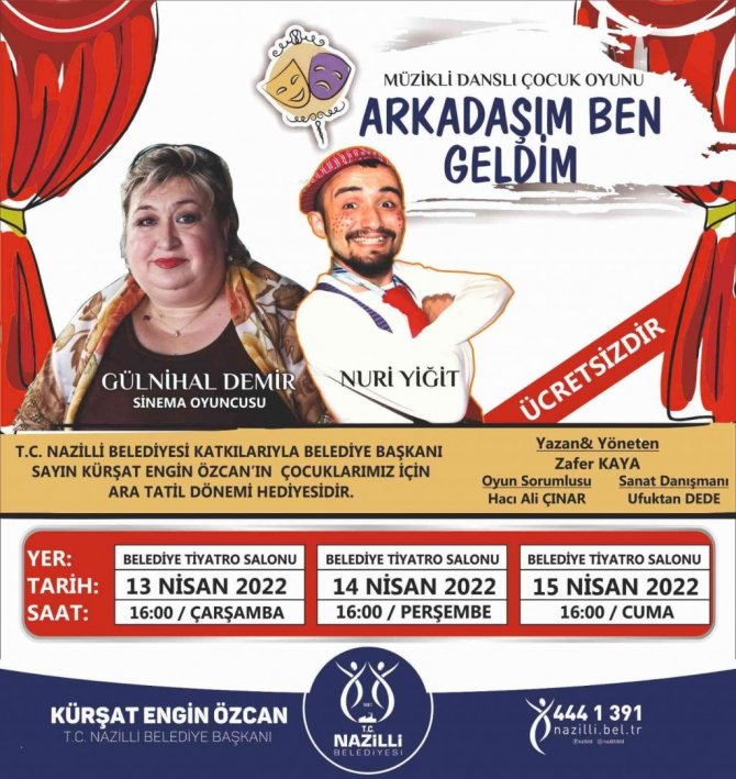 Sosyal sorumluluk projeleri ve kültür sanat alanındaki çalışmalarıyla vatandaşın takdirini toplayan Nazilli Belediyesi, ikinci dönem ara tatiline giren öğrencileri unutmadı. Türkiye'nin tanınmış simalarından yetenekli Sinema Oyuncusu Gülnihal Demir, Nuri Yiğit ve Zafer Kaya'nın sahne alacağı müzikli danslı çocuk oyunu Arkadaşım Ben Geldim ve Geleneksel Türk Tiyatrosu'nun en güzel örneklerinden olan Karagöz'ün Cehaleti, 3 gün boyunca çocuklar için sahnelenecek. Mehmet Yüzügüler Kültür Merkezi Tiyatro Salonu'nda düzenlenecek etkinlikler 13 Nisan Çarşamba günü saat 14.00'de başlayacak.