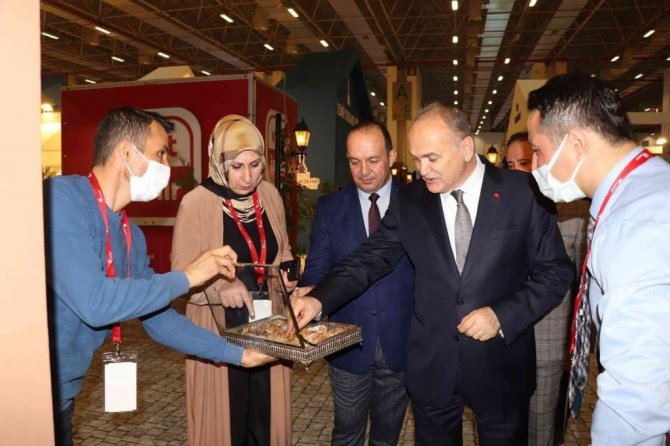 Başkan Özlü İzmir fuarında zeytin kırdı, halı dokudu