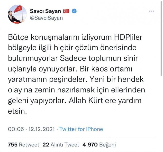 "Bütçe konuşmalarını izliyorum HDP'liler bölgeyle ilgili hiçbir çözüm önerisinde bulunmuyorlar. Sadece toplumun sinir uçlarıyla oynuyorlar. Bir kaos ortamı oluşturmanın peşindeler. Yeni bir hendek olayına zemin hazırlamak için ellerinden geleni yapıyorlar. Allah Kürtlere yardım etsin."