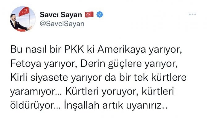 Belediye Başkanı Savcı Sayan, sosyal medya hesabından yaptığı paylaşımla PKK'nın Amerika, FETÖ ve derdin güçlere yaradığını belirterek şu ifadelere yer verdi: