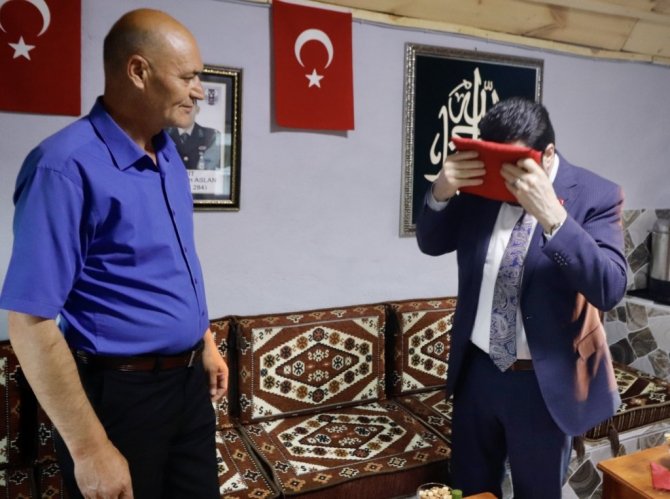 Ağrı Belediye Başkanı Savcı Sayan, Pençe-Kaplan Harekatı'nın sürdürüldüğü Irak'ın kuzeyinde teröristlerin hain saldırısı sonucu şehit olan Piyade Teğmen Harun Aslan'ın ailesini evinde ziyaret etti.