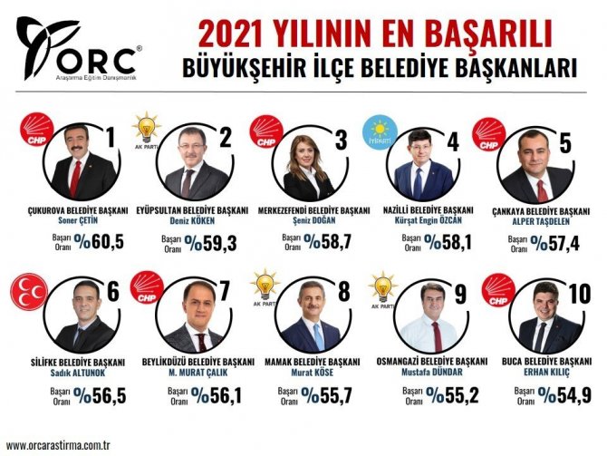 ORC Araştırma Şirketi, 2021 yılının en başarılı büyükşehir belediye başkanları, en başarılı büyükşehir ilçe belediye başkanları, en başarılı il belediye başkanları ve en başarılı milletvekilleri anket sonuçlarını paylaştı. Araştırmada en başarılı milletvekilleri, en başarılı büyükşehir belediye başkanları, en başarılı il belediye başkanları ve ilçe belediye başkanları anketinde dikkat çeken sonuçlar yer aldı .