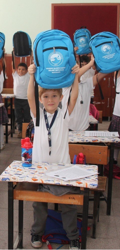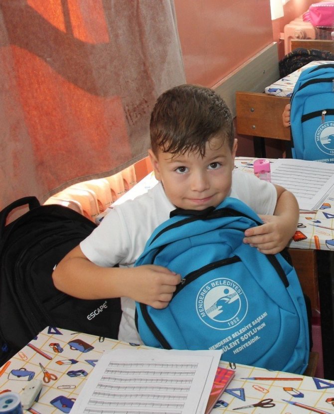 Menderes Belediyesi Kültür ve Sosyal İşler Müdürlüğü tarafından dağıtılan sırt çantasın içinde kuru boya, pastel boya, sulu boya, keçeli boya, resim defteri, cetvel seti, kalem seti, kalem kutusu, el işi kağıdı, yapıştırıcı, not defteri 25 ilk öğretim okulunda bin 200 öğrenciye hediye edildi.