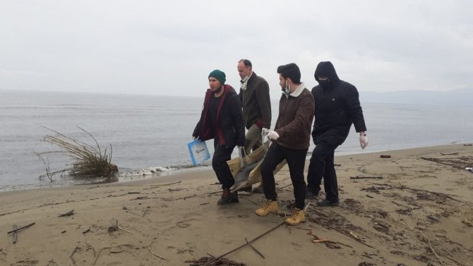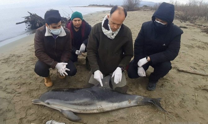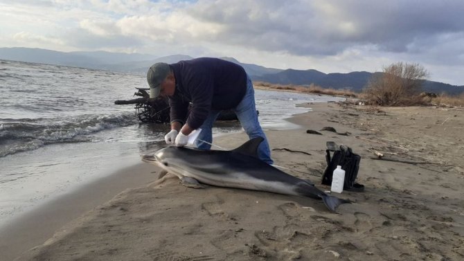 Ekosistemi Koruma ve Doğa Sevenler Derneği (EKODOSD) Başkanı Bahattin Sürücü, Pamucak sahilinde karaya vuran çizgili yunusu inceledi. Trol ağına takılarak öldüğü düşünülen yunus, eğitim araştırmaları için üniversiteye götürüldü.