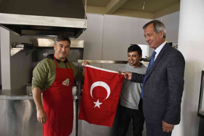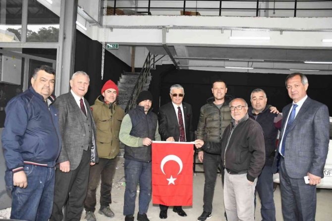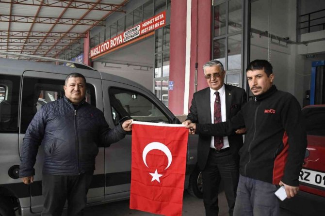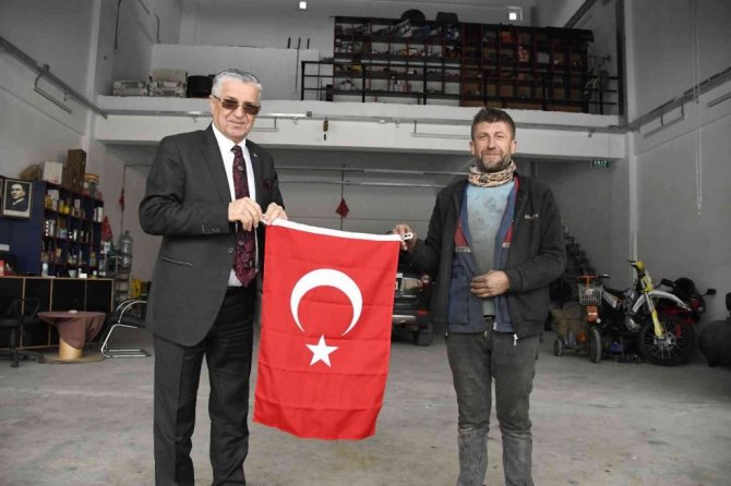 Kemer Belediye Başkanı Necati Topaloğlu, sanayi esnafıyla bir araya gelerek esnafa Türk Bayrağı hediye etti.