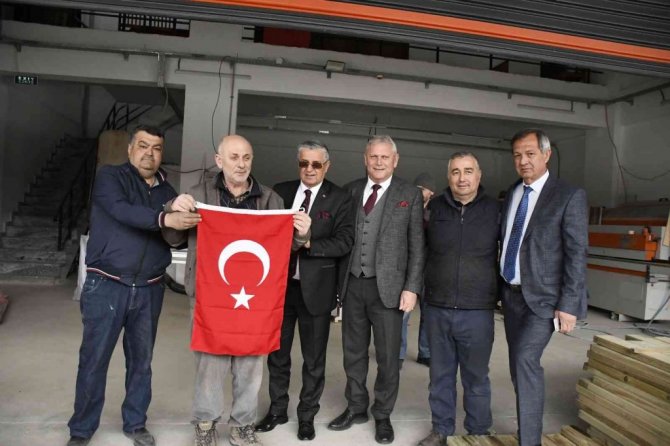 Yeni işyerlerine taşınan sanayi esnafını tek tek ziyaret eden Başkan Topaloğlu ve beraberindekiler, esnafa hayırlı olsun dileklerinde bulunarak, Türk Bayrağı hediye etti.