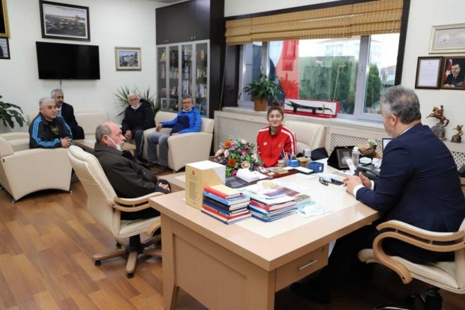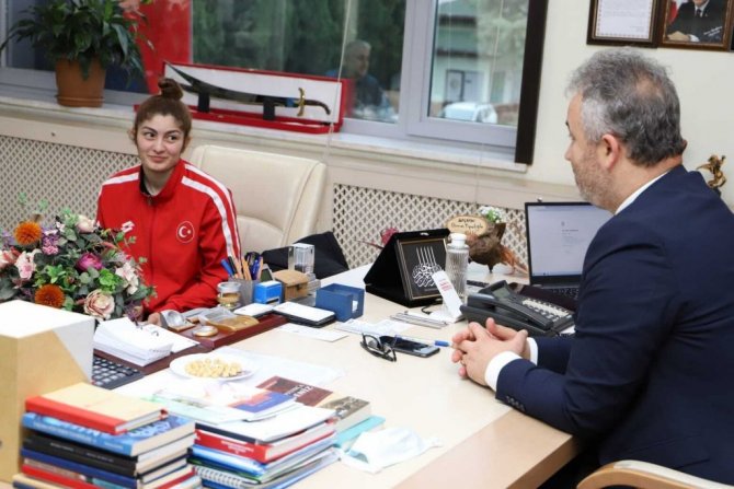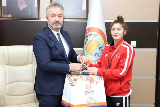 İşitme Engelliler Dünya Karate Şampiyonası'nda dünya üçüncüsü olan Sinem Özkan, 19 Mayıs Belediye Başkanı Osman Topaloğlu'nu makamında ziyaret etti.