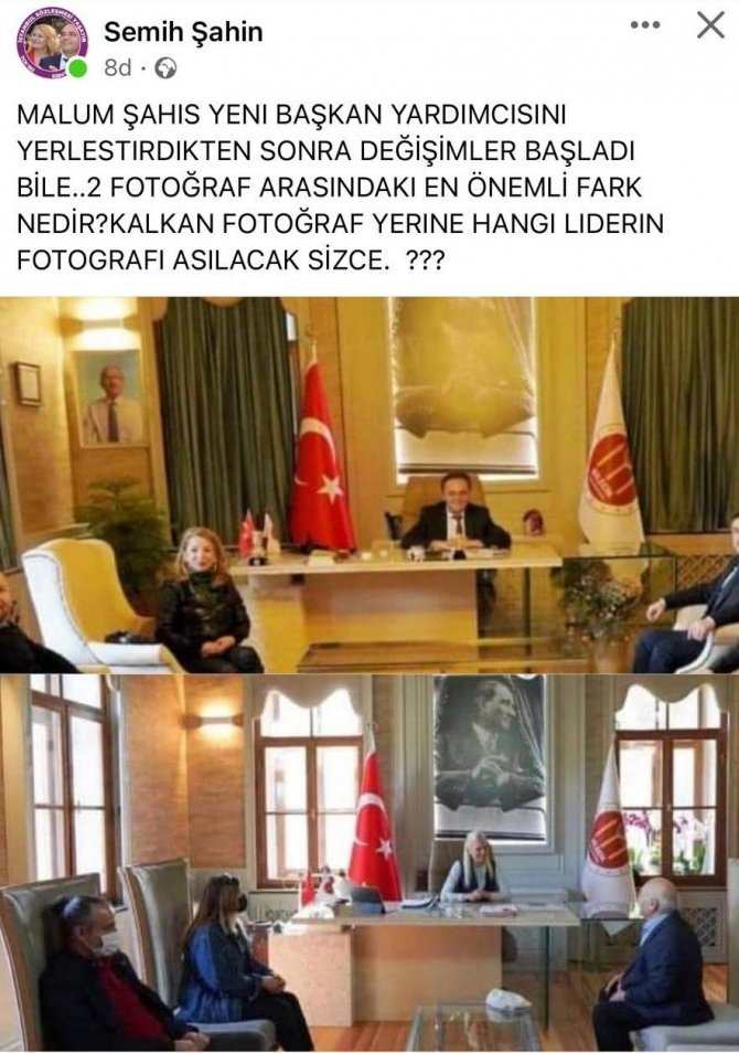 Dün halk gününden makamda fotoğraf karası paylaşan Melek Mızrak Subaşı'nın arkasında CHP Genel Başkanı Kemal Kılıçdaroğlu'nun fotoğraf karesi olmadığı görüldü. Bu duruma tepki gösteren Semih Şahin, "Malum şahıs yeni başkan yardımcısını yerleştirdikten sonra değişimler başladı bile. 2 fotoğraf arasındaki en önemli fark nedir? Kalkan fotoğraf yerine hangi liderin fotoğrafı asılacak sizce" diyerek tepki gösterdi.