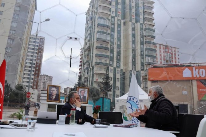 Talas Belediye Başkanı Mustafa Yalçın, yeni bir uygulamaya imza atarak, belediyeye gelemeyen vatandaşlarla mahalle meydanında görüşmeye başladı. "Başkanla baş başa" sloganı ile iglo şeklinde tasarlanan şeffaf odada vatandaşlarla görüşen Yalçın, sorunları dinleyerek, çözüm üretiyor. İstek ve taleplerin yanı sıra çeşitli öneri ve projelerin de dile getirildiği programda Talas adına güzel sonuçlar elde ediliyor. Her hafta çarşamba günleri makam odasını vatandaşın ayağına taşıyarak birebir görüşmeye başlayan Mustafa Yalçın, vatandaşlarında takdirini topluyor.
