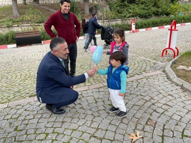 AK Parti Bilecik İl Başkanı Serkan Yıldırım, Şeyh Edebali Türbesini ziyaretinde etrafta bulunan çocuklara pamuk şekeri dağıtarak sevindirdi.