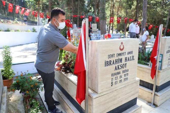 Alanya Müftülüsü İhsan İlhan, Alanya Belediyesi Park ve Bahçeler Müdürü Nazmi Uyar ve Alanya Belediyesi Zabıta Müdürü Naci Uzunsakal ile birlikte sahipsiz mezarlara çiçek diken Başkan Yücel, daha sonra Alanya Garnizon Şehitliği'nde dua etti.