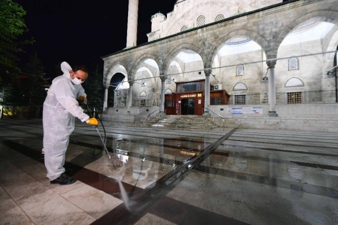 Ankara Büyükşehir Belediyesi normalleşme sürecinde yeniden ibadete açılan camilerde hijyen çalışmalarını artırdı. Geçtiğimiz hafta uzun bir aradan sonra ibadete açılan 65 camide Cuma namazı öncesi dezenfeksiyon ve temizlik çalışması gerçekleştiren Büyükşehir ekipleri, bu hafta da cami avluları ve çevresinde 7/24 yoğun bir temizlik ve dezenfeksiyon mesaisi yaptı.