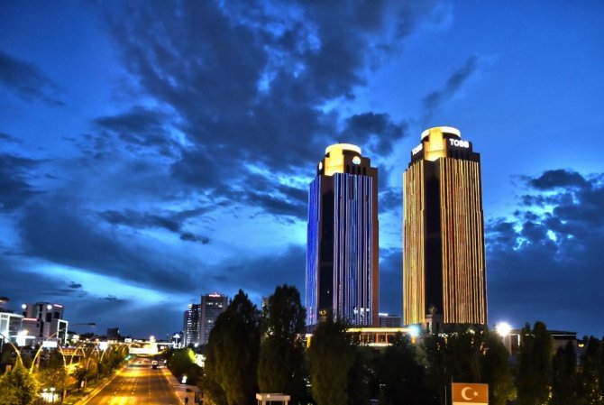 Başkent'te bulunan sembol binalar Atakule ve TOBB İkiz Kuleleri, 9 Mayıs Avrupa Günü nedeniyle özel olarak ışıklandırıldı.