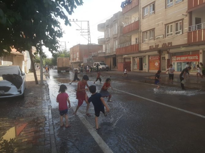 Batman'da patlayan temiz su borusu caddeyi göle çevirirken, sıcaktan bunalan mahallenin çocukları suda oynayarak eğlendi.