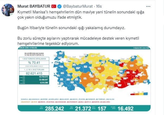 Sosyal medya hesabından Sağlık Bakanlığının Covid-19 Aşı Bilgilendirme Tablosunu paylaşan AK Parti MKYK Üyesi ve Manisa Milletvekili Murat Baybatur, aşılarını yaptırarak, mücadeleye destek veren Manisalılara teşekkür etti.