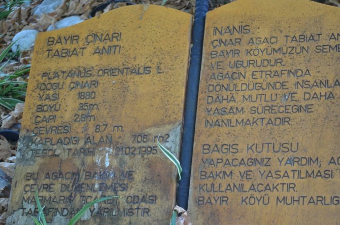 Marmaris'e 30 kilometre mesafedeki Bayır Mahallesi'nde bulunan Anıtlar Kurulu tarafından "anıt ağaç" olarak tescillenen ve tahminlere göre 2 bin yıllık olan çınar ağacı yıllara meydan okuyor. Birkaç yıl önce aşırı rüzgardan dalları zarar gören ağaç tüm heybeti ile köy meydanında ziyaretçilerini ağırlıyor. 1995 yılında anıt ağaç olarak tescil edilen tarihi çınar ağacına mahalleli gözü gibi bakıyor. Ağaç yerli ve yabancı turistlerin ilgisini çekiyor. Batıl inanca göre de 20 asırlık ağacın etrafından beş tur atan mutlu bir haber alıyor ya da tıpkı çınar ağacı gibi uzun ömürlü olacağına inanılıyor.
